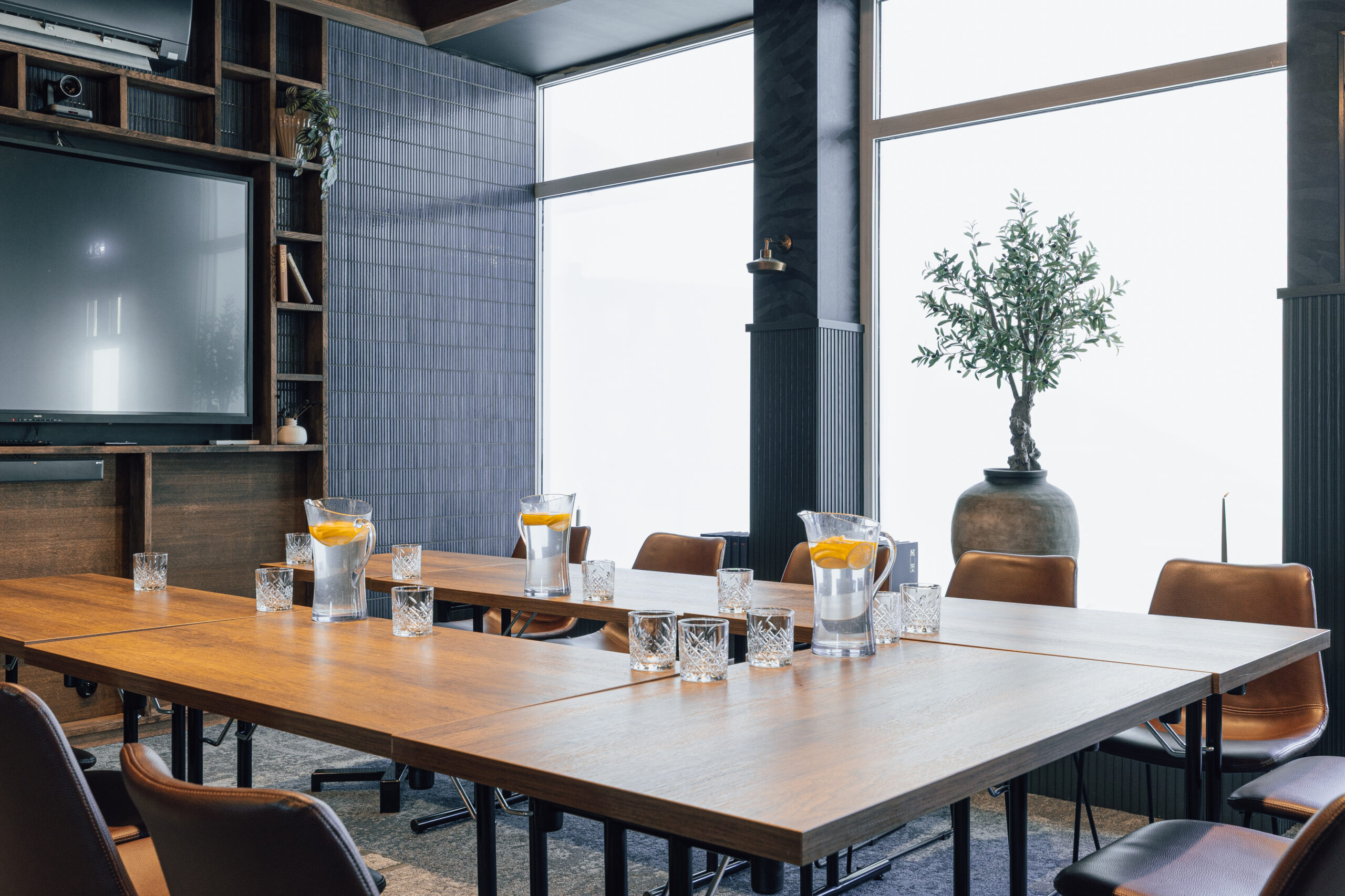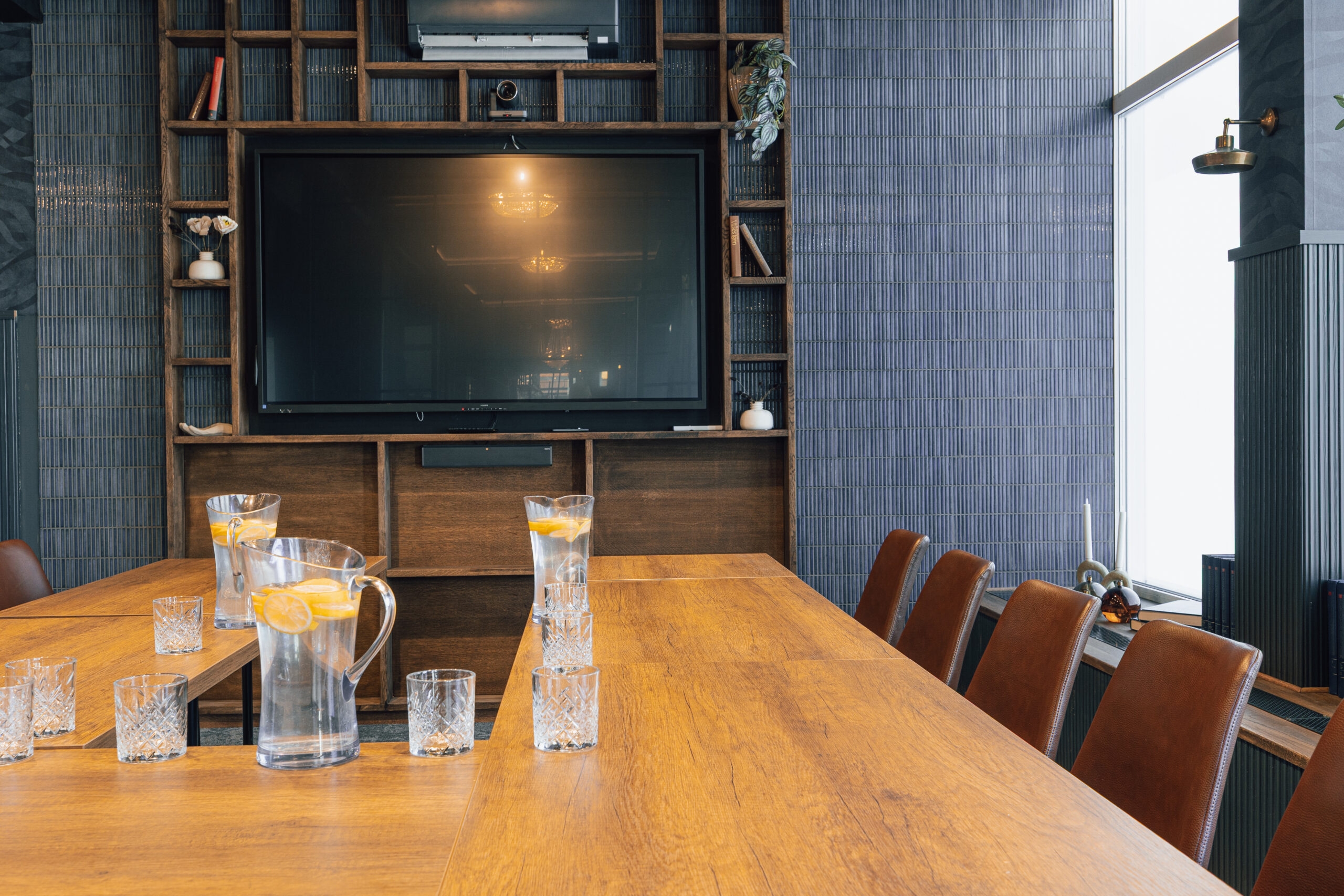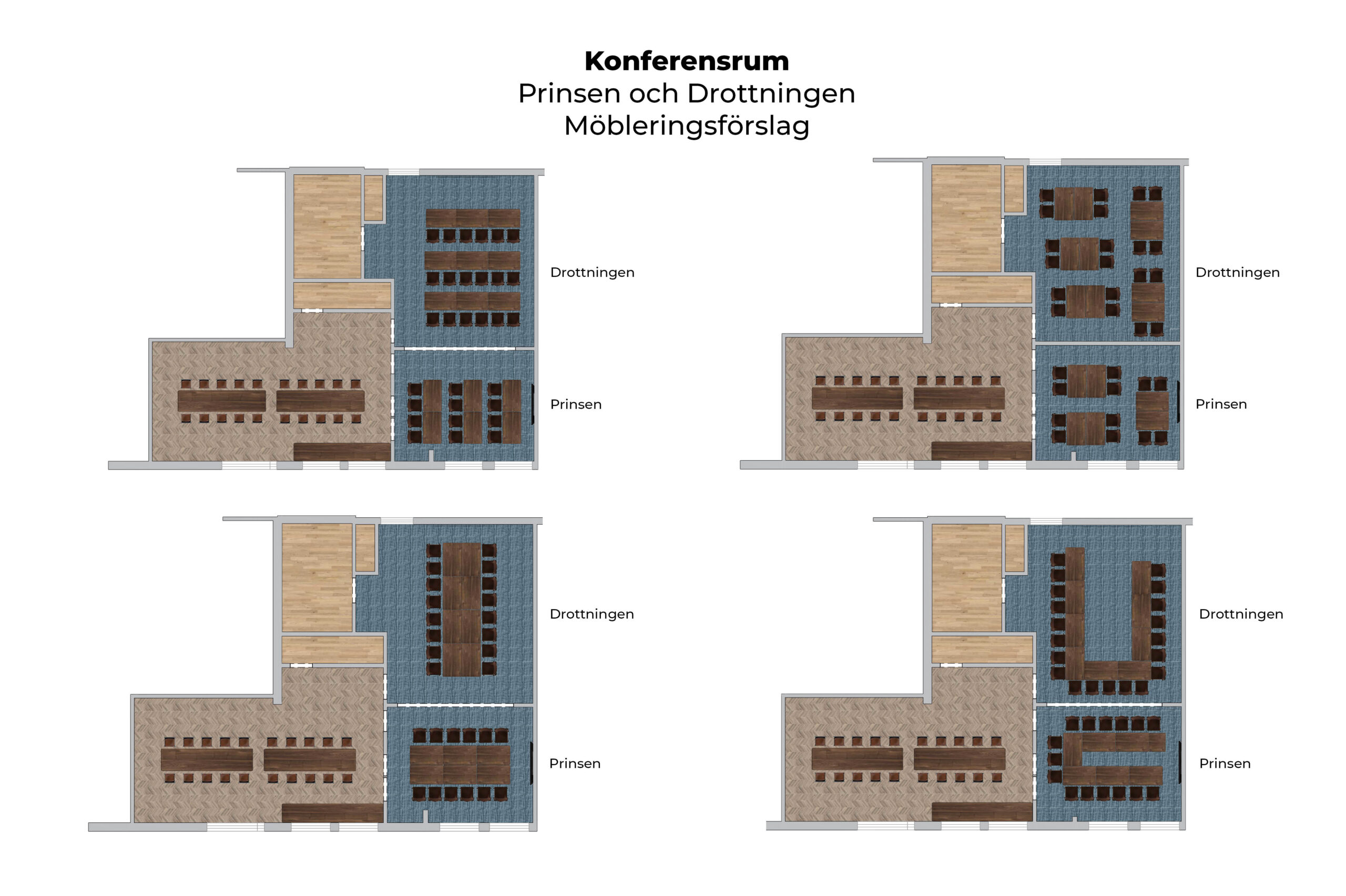Konferensrum Prinsen är ett ljust och mysigt konferensrum om ca 20 kvm med upp till 20 sittplatser perfekt – för styrelsemötet, ledningsgruppen eller den mindre utbildningen. Rummet har väldigt fin konferensutrustning i form av en 75″ TV med touch som även är möjlig att använda som whiteboardtavla, inbyggd ljudsystem samt kamera och mikrofon för videomöten. Blädderblock finns tillgängligt. Det går att möblera på flera sätt: