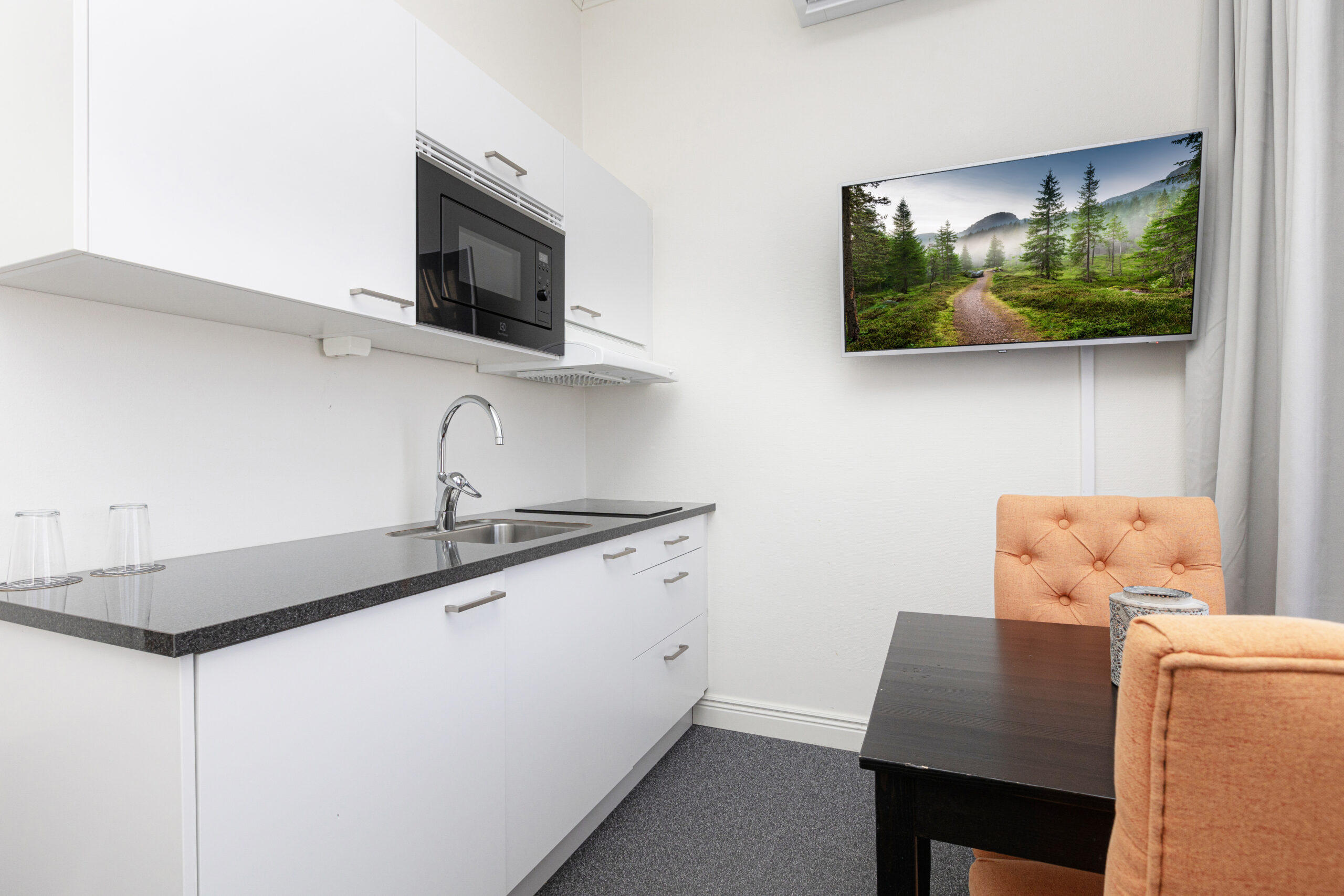 På hotellet har du möjlighet att laga din egen mat i vårt gästpentry bredvid receptionen. Pentryt är fullt utrustat och inkluderar en induktionshäll, mikrovågsugn, diskmaskin och vattenkokare. Självklart finns all köksutrustning såsom kastruller, tallrikar & bestick, slevar, vispar och mycket mer.